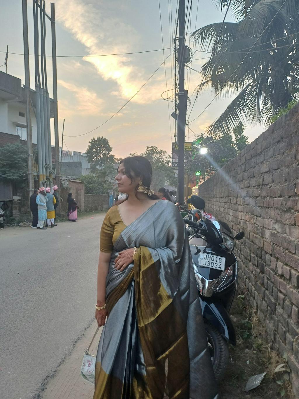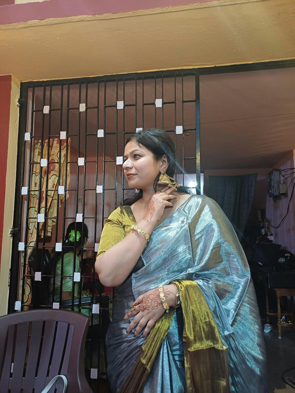 Style our gold and silver tissue silk saree with minimal accessories and high heels paired with a classy yet chic clutch and you are good to go!